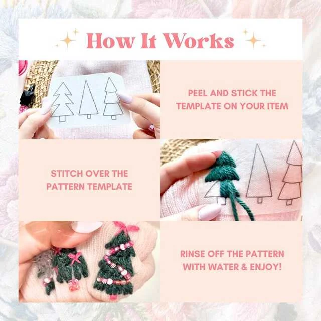 The best part? The design comes pre-transferred onto a water-soluble stabilizer, so you don’t have to worry about drawing or tracing anything! Just peel off the pattern, stick it onto your fabric (yes, it’s as easy as a sticker!), stitch away, rinse the stabilizer off with warm water, and voilà—your Christmas tree is ready to shine! 🌟✨