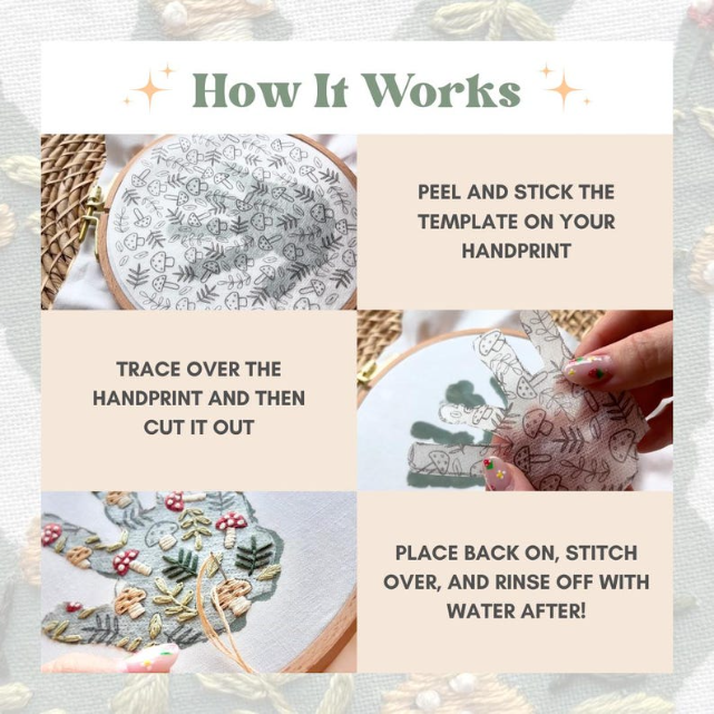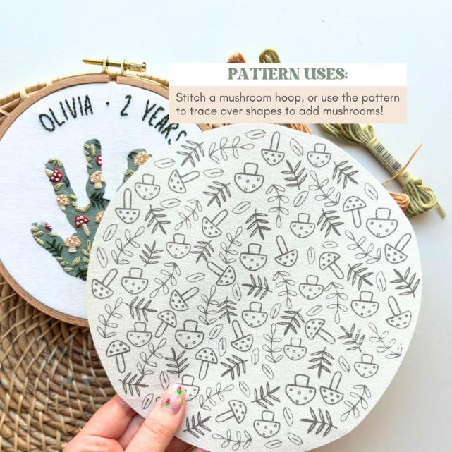Choose between whimsical mushrooms 🍄 or pretty floral 🌸 patterns to make your hoop truly unique. Each pattern comes pre-transferred so there’s no fuss—just peel, stick, and start stitching your masterpiece!