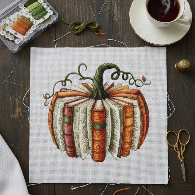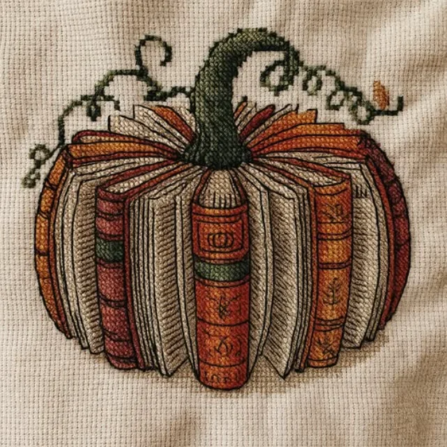 Stitching meets storytelling 🪡📖 Each detail is carefully designed to highlight the rich textures of pumpkin shades and the delicate look of stacked pages. With DMC floss included, every stitch brings depth and charm to your autumn masterpiece.
