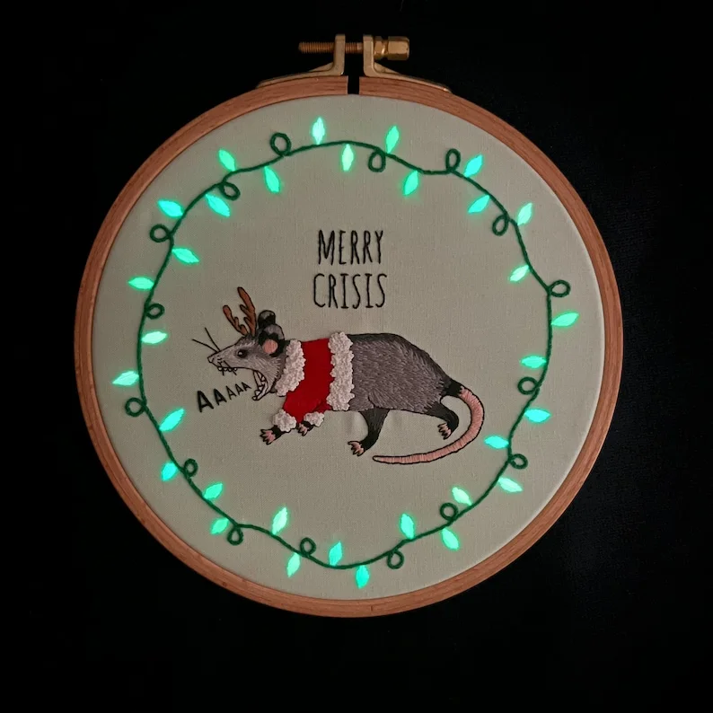 I love me some festive anxiety ✨I hope your holiday season has minimal crises but stitching this glow in the dark holiday opossum might just cheer you up enough to overcome some of them.