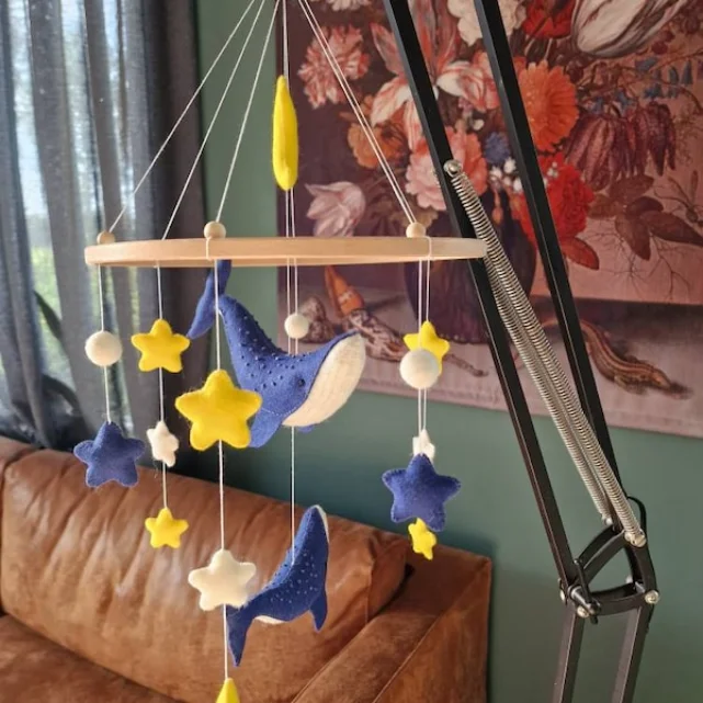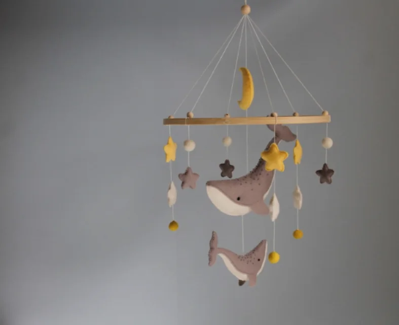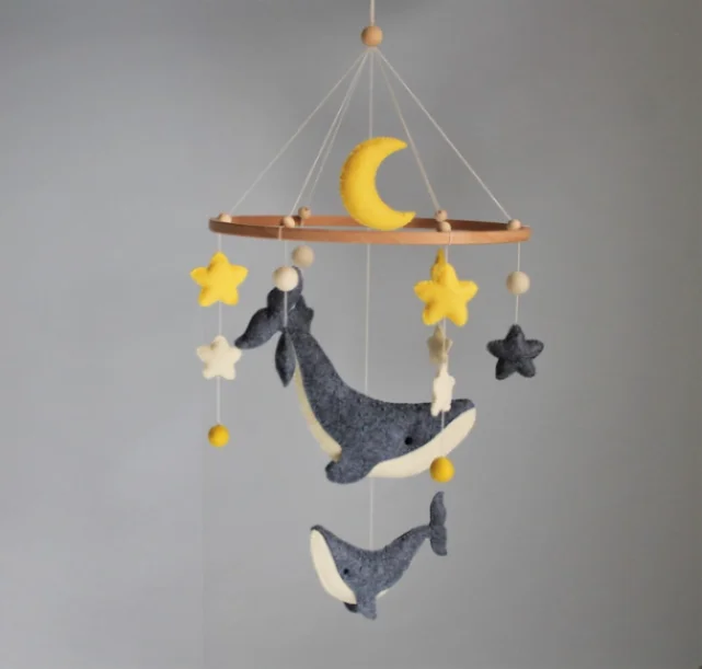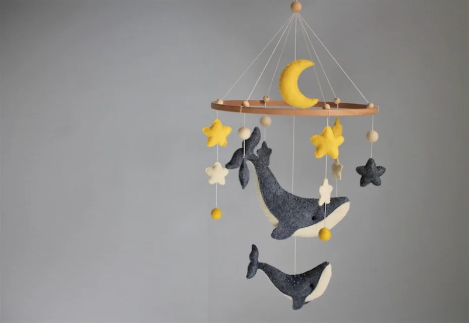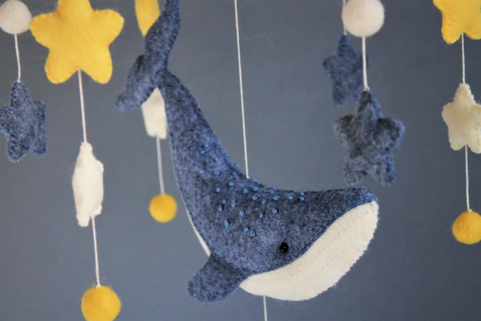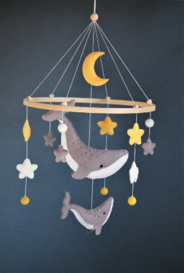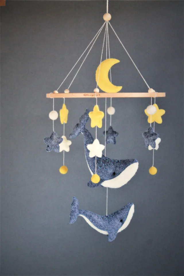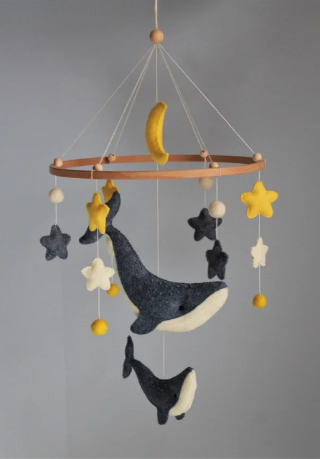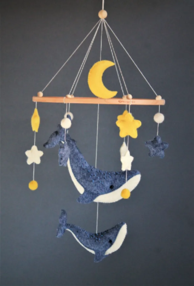 From the big whale (8"x3") to the tiny star (3.5 cm), each piece is made to delight and soothe. Arrange them however you like for a custom, one-of-a-kind baby mobile.