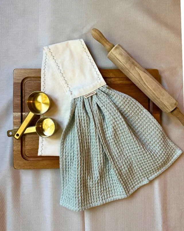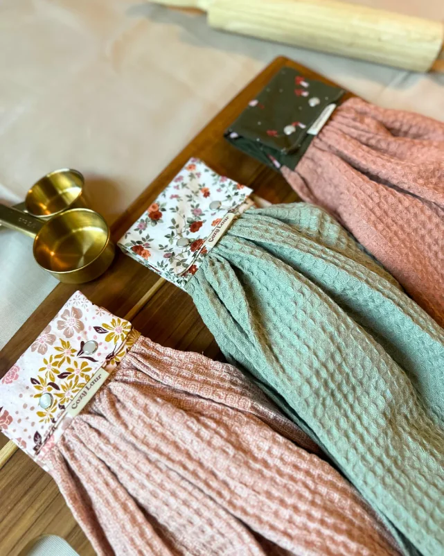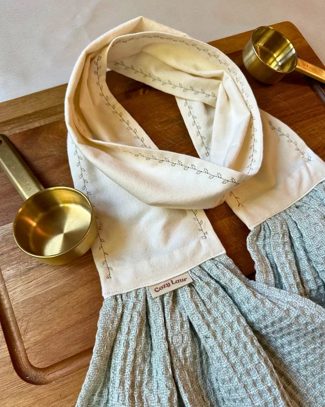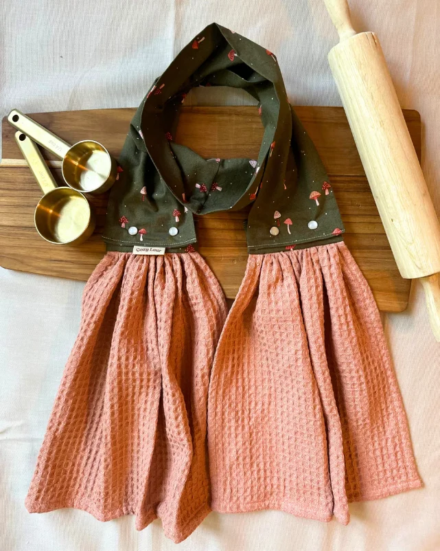 With our sewing template and tutorial, you’ll whip up your own towel scarf in no time. Customize it with your favorite fabrics — dark green mushrooms, terracotta waffles, or whatever vibe your kitchen rocks! 🍄🧵